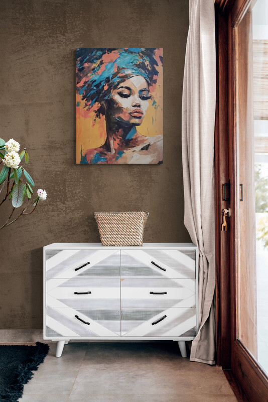 In this captivating oil painting, a resplendent woman takes center stage, adorned with a vibrant headdress boasting hues of blue, red, brown, and gold. Her enigmatic aura exudes a poised grace, effortlessly merging composure with a sense of carefree contemplation.