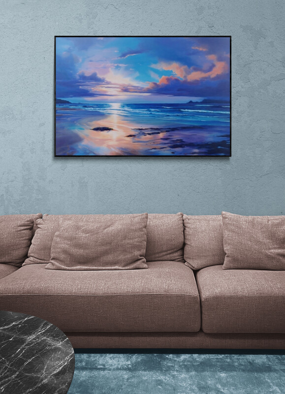 Experience the tranquil magic of ‘Hue of My Soul’, a captivating oil painting that transports you to the serene shores of a sunrise beach. This masterpiece, rendered in a symphony of colors featuring blues, purples, and oranges, captures the essence of a new day dawning.