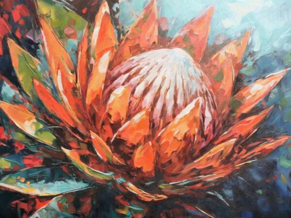 Incorporating colours of predominantly red, orange, blue and green, “Protea” is more than just a painting; it’s an invitation to appreciate the world’s delicate wonders and to experience the South African landscape’s vivid charm from the comfort of your own space. Don’t miss the opportunity to own this remarkable work of art, a testament to the power of nature and human creativity.